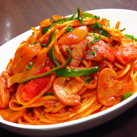 お料理は当店名物のナポリタンやピザ、生ハムなどイタリア料理を中心にご用意しております。